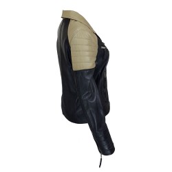 perfecto femme en cuir d’agneau bi couleur, doublure polyester, fermeture par zip asymétrique, trois poches zippées sur le devant, pour une  tenue sobre et décontractée.